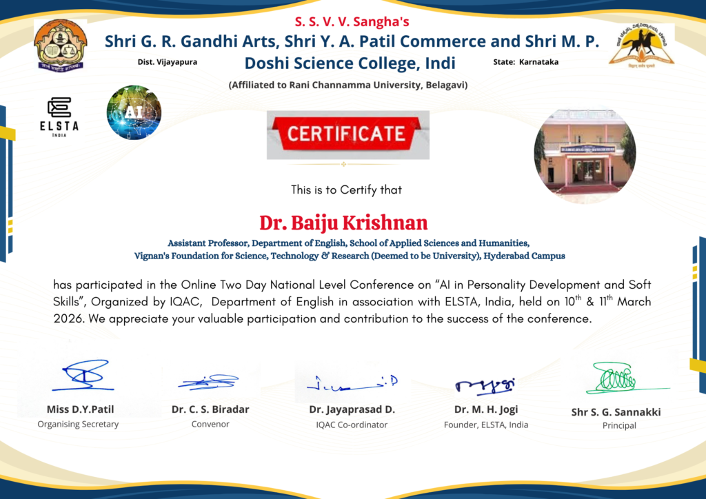 Indi, Shri G. R. Gandhi Arts, Shri Y. A. Patil Commerce and Shri M. P. Doshi Science College, Indi, Vijayapur, Karnataka, Online Two-Day Conference on ” AI in Personality Development and Soft Skills”